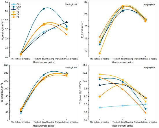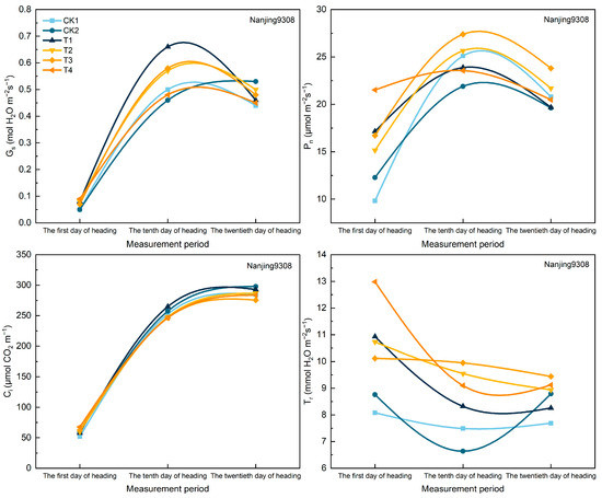 Effect of different treatments on photosynthetic rate of ‘Nanjing 9308’. Gs, stomatal conductance; Pn, net photosynthetic rat; Ci, intercellular CO2 concentration; Tr, transpiration rate.