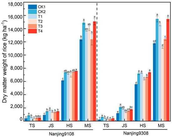 Effect of different fertilization treatments on dry matter weight of rice. Different letters indicate a significant difference among treatments (p < 0.05). TS: Tillering stage; JS: Jointing stage; HS: Heading stage; MS: Maturity stage.