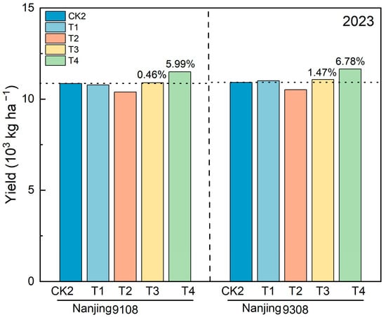 A comparison of the yield performance between treatments (T1–T4) and CK2 in 2023 is provided in Table 4 and Figure 7 and Figure 8. Specifically, T4 exhibited the most substantial increase, corresponding to 5.99% and 6.78% improvement. In contrast, T3 resulted in more modest increases of 0.46% and 1.47%, respectively. These results support a positive correlation between higher grain percentage and improved yield, The higher the grain percentage, the higher the yield.