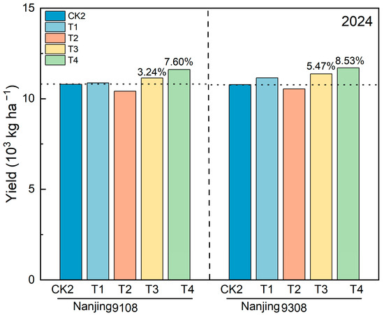 As shown in Table 3, in 2023, yield differences between CK2 and T4 were not significant, but in 2024, T4 improved yield by 7.60% and 8.53% in ‘Nanjing 9108’ and ‘Nanjing 9308’, respectively. Yield improvements were primarily attributed to increased effective panicle number and grains per panicle, while differences in grain-setting rate and 1000-grain weight were not statistically significant. For example, T4 average increased effective panicle number by 19% and 19.05% in ‘Nanjing 9108’ and ‘Nanjing 9308’, respectively, compared to CK2.