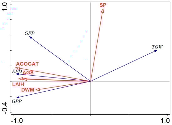 Correlation coefficients between rice yield composition and some indexes under 6 nitrogen fertilizer treatments across the two years. TGW, 1000-grain weight; EPD, effective panicle density; GFP, grain filling percentage; GPP, Grains per panicle; AGS, the activity of GS; AGOGAT, the activity of GOGAT; DWM, dry weight at maturity stage; LAIH, Leaf area index at heading stage; SP, Spike as a proportion of dry matter weight. The correlation is positive when the angle between the arrows is acute and negative when the angle between the arrows is larger than 90 degrees. The correlation between two indicators is interpreted by projecting one onto the arrow representing the other: the farther the projection point lies in the direction of the arrow, the stronger the positive correlation; a point near the coordinate origin suggests a near-zero correlation, whereas a projection in the opposite direction indicates a negative correlation.