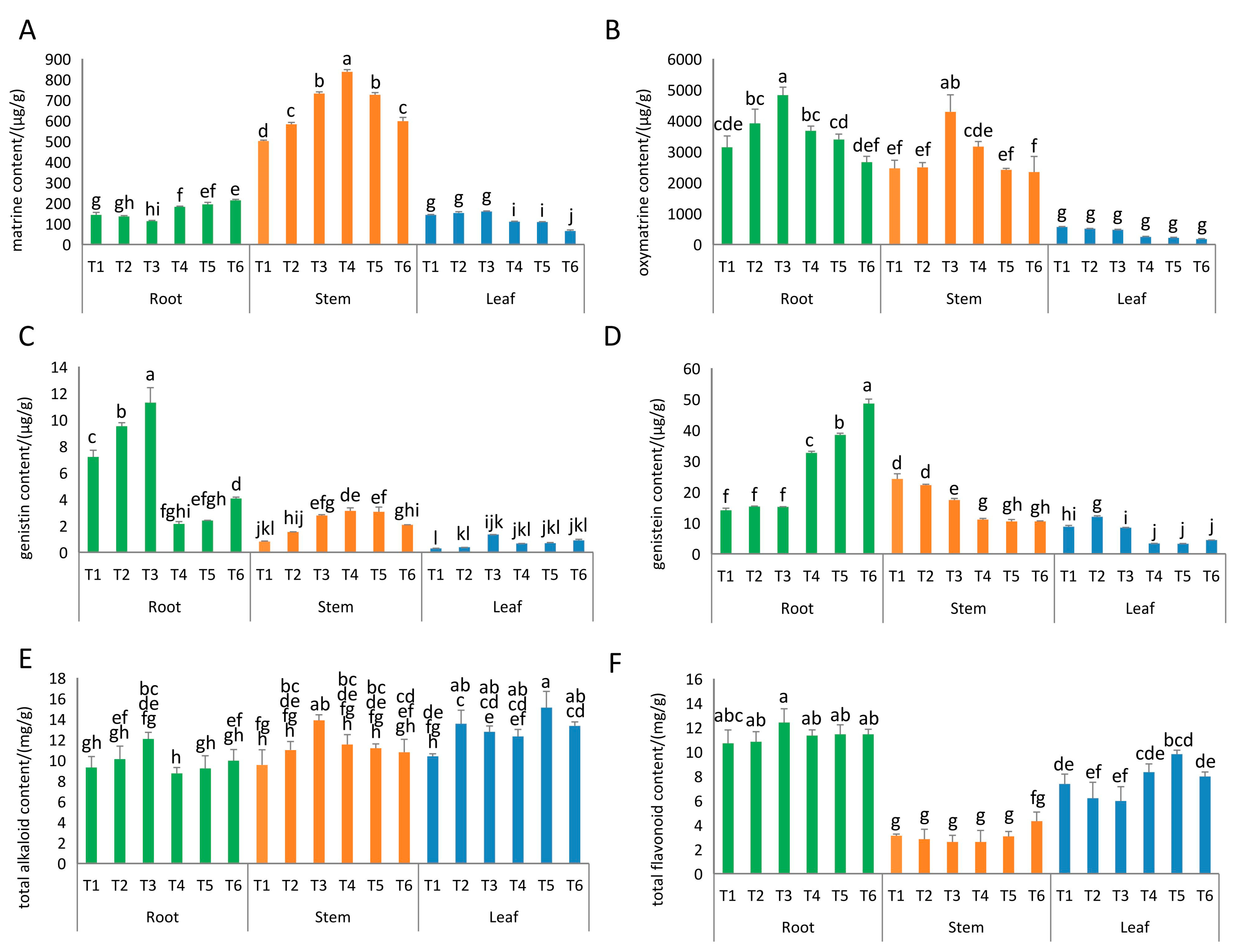 In the stems, the results were mixed. Under normal moisture (T1), an increasing concentration of SiO2 NPs led to higher levels of matrine, oxymatrine, genistin, and total alkaloids. When spraying 200 mg/L SiO2 NPs, the contents of oxymatrine (4289.98 μg/g) and total alkaloids (13.87 mg/g) reached the highest values. However, under drought stress (T4), the contents of matrine, oxymatrine, genistin, and total alkaloids decreased as the SiO2 NPs concentration increased.