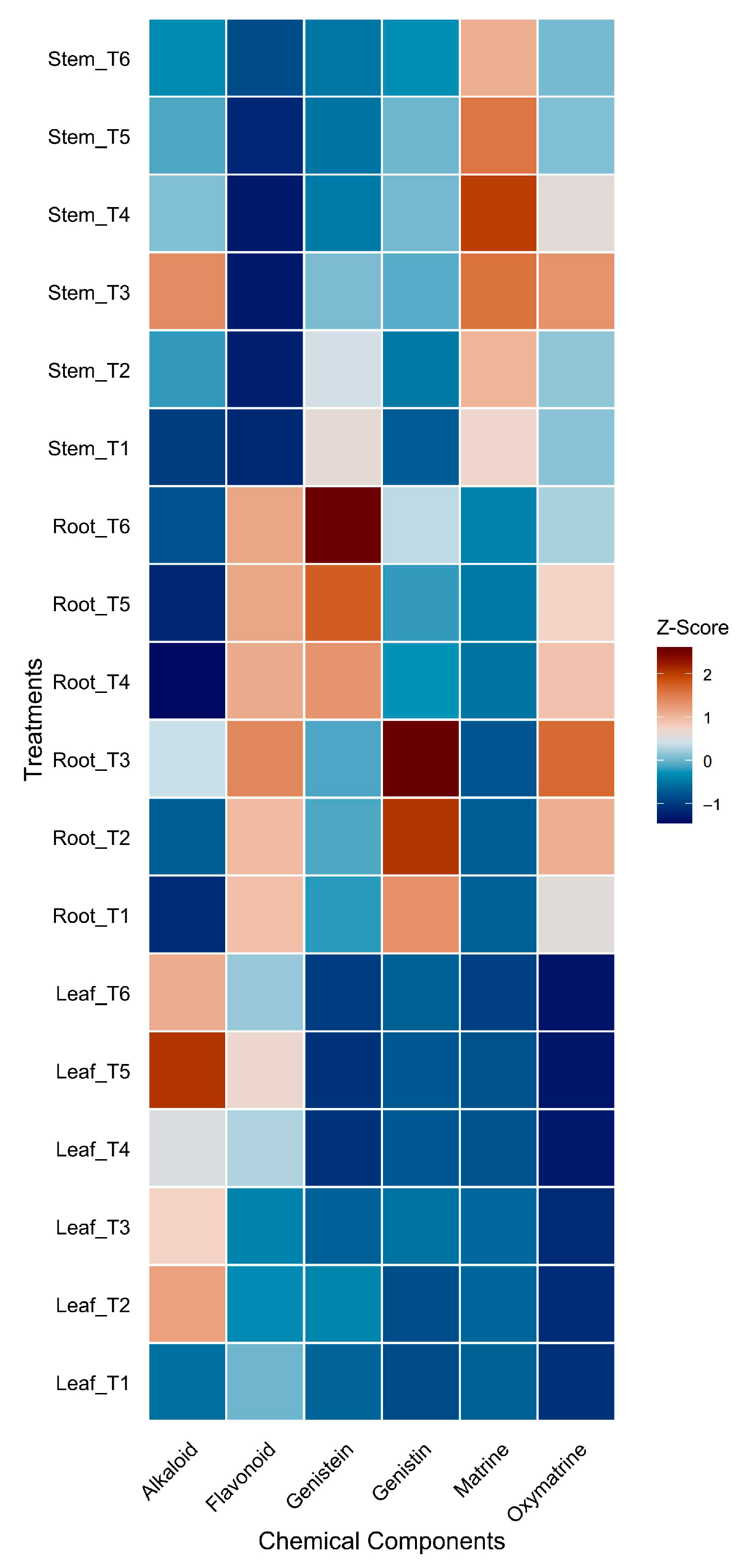 This study evaluated the effects of foliar application of SiO2 NPs on the content of bioactive compounds in S. tonkinensis under both normal moisture conditions (T1) and drought stress (T4) conditions (Figure 2). A striking finding was the remarkable 244.33% increase in genistein content in the roots under T6 (drought + 200 mg/L SiO2 NPs) compared to the well-watered control (T1), highlighting the high biotechnological potential of SiO2 NPs to elicit valuable secondary metabolites under stress. The active ingredients, including matrine, oxymatrine, genistin, genistein, total alkaloids, and total flavonoids, were analyzed in the roots, stems, and leaves of the plant. The distinct patterns of response between different plant organs and compounds are visually summarized in the integrative heatmap (Figure 3), which illustrates the relative variation in each compound across all treatments.
