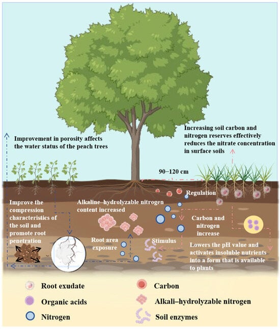 Root-exudate-mediated alterations in soil structure induced by companion crops affect nitrogen turnover efficiency in host plants (e.g., peach trees) (Figure 1; Table 1). Scandellari et al. [47] investigated nitrogen uptake and release dynamics in peach tree roots grown in coarse-textured (CT) and fine-textured (FT) soils. Sun et al. [36] studied 4-year-old “Ruiguang 33” (Prunus persica L.), examining the effects of root zone aeration on soil microbial communities and nitrogen nutrition. The study revealed that aeration treatment significantly increased the relative abundance of nitrogen-fixing microbes (Bradyrhizobium elkanii) and potassium-solubilizing microbes (Bacillus circulans), alongside elevated soil alkaline-hydrolyzable nitrogen content and total plant nitrogen content. Concurrently, improved porosity not only optimized the water-use efficiency in peach trees but also indirectly enhanced the leaf nitrogen content by promoting companion crop growth [48]. Based on a 22-year long-term positioning experiment in subtropical hilly areas, Li et al. [37] compared the impacts of different soil conservation measures on orchard soil quality. They found that legume-based biological measures significantly improved the Soil Quality Index (SQI) by enhancing soil aggregates, thereby maintaining the soil nutrient balance and aggregate stoichiometric stability.