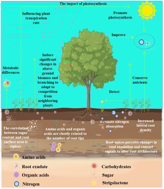 This aboveground trait improvement exhibits strong species specificity. Xu et al. [65] reported that mixed planting of phylogenetically close ryegrass (Lolium perenne) varieties advanced flowering time. Beyond morphology, root exudates profoundly influence the physiological and biochemical properties. Vengavasi et al. [45] observed that phosphorus-efficient soybean varieties exhibit higher photosynthetic rates, total chlorophyll, and carotenoid concentrations compared with phosphorus-inefficient counterparts. Lu et al. [66] identified metabolic differences in carbohydrates and amino acids within root exudates as the primary driver of photosynthetic divergence. Furthermore, Zhou et al. [67] confirmed that root exudates regulate transpiration by modulating amino acid metabolism.