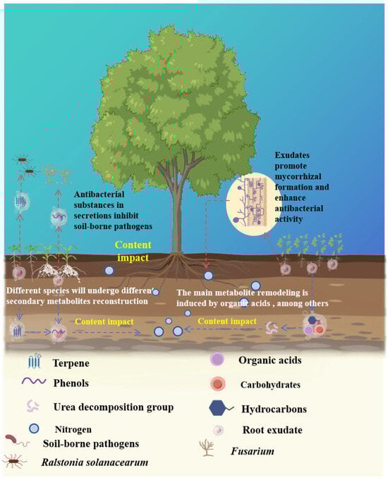 Increasing ecosystem diversity is a primary strategy for suppressing soil-borne diseases. For instance, long-term monocropping of faba bean (Vicia faba) results in a high incidence of F. oxysporum, but wheat (Triticum aestivum)–faba bean intercropping significantly reduces Fusarium wilt incidence and severity by restructuring the rhizosphere microenvironment through accumulation of salicylic acid, p-hydroxybenzoic acid, tartaric acid, malic acid, glutamic acid, and threonine [84]. Similarly, orchard replant disease can be mitigated by introducing exogenous root exudates. Zhang et al. showed that peanut (Arachis hypogaea) root exudates suppress Fusarium solanum growth in grape (Vitis vinifera) replant soils [85]. In pear (Pyrus spp.)–morel (Morchella spp.) intercropping systems, significant accumulation of amino acids (phenylalanine, lysine, proline, citrulline, and ornithine), sugars (arabitol and glucosamine), and organic acids (quinic acid, fumaric acid, and malic acid) further inhibits Fusarium and Aspergillus pathogens [86]. Tang et al. [87] reported that dimethyl disulfide and diallyl disulfide from Chinese chive (Allium tuberosum) root exudates reduce apple replant disease by suppressing Fusarium solani mycelial growth and spore germination.
