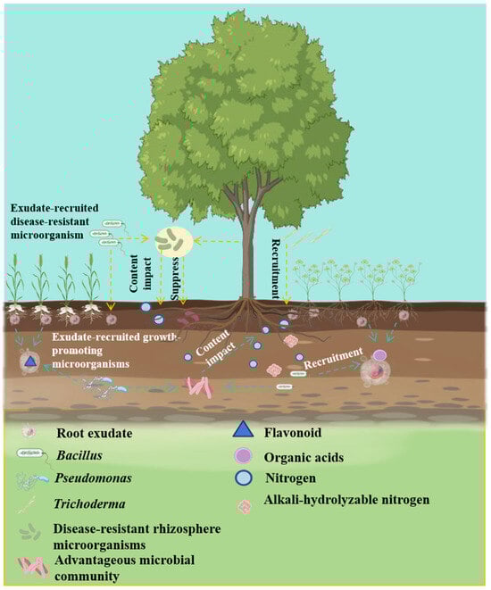 This review systematically elaborates on the regulatory mechanisms by which root exudates from food crops, oil crops, vegetables, and herbaceous plants modulate ecological functions in planting systems. It focuses on their roles in driving key processes such as soil physicochemical properties, plant traits, rhizosphere metabolite remodeling, and microbiome recruitment. Furthermore, the review explores how these regulatory mechanisms influence N utilization strategies in multi-planting systems involving fruit trees (woody, lianas, herbaceous species).