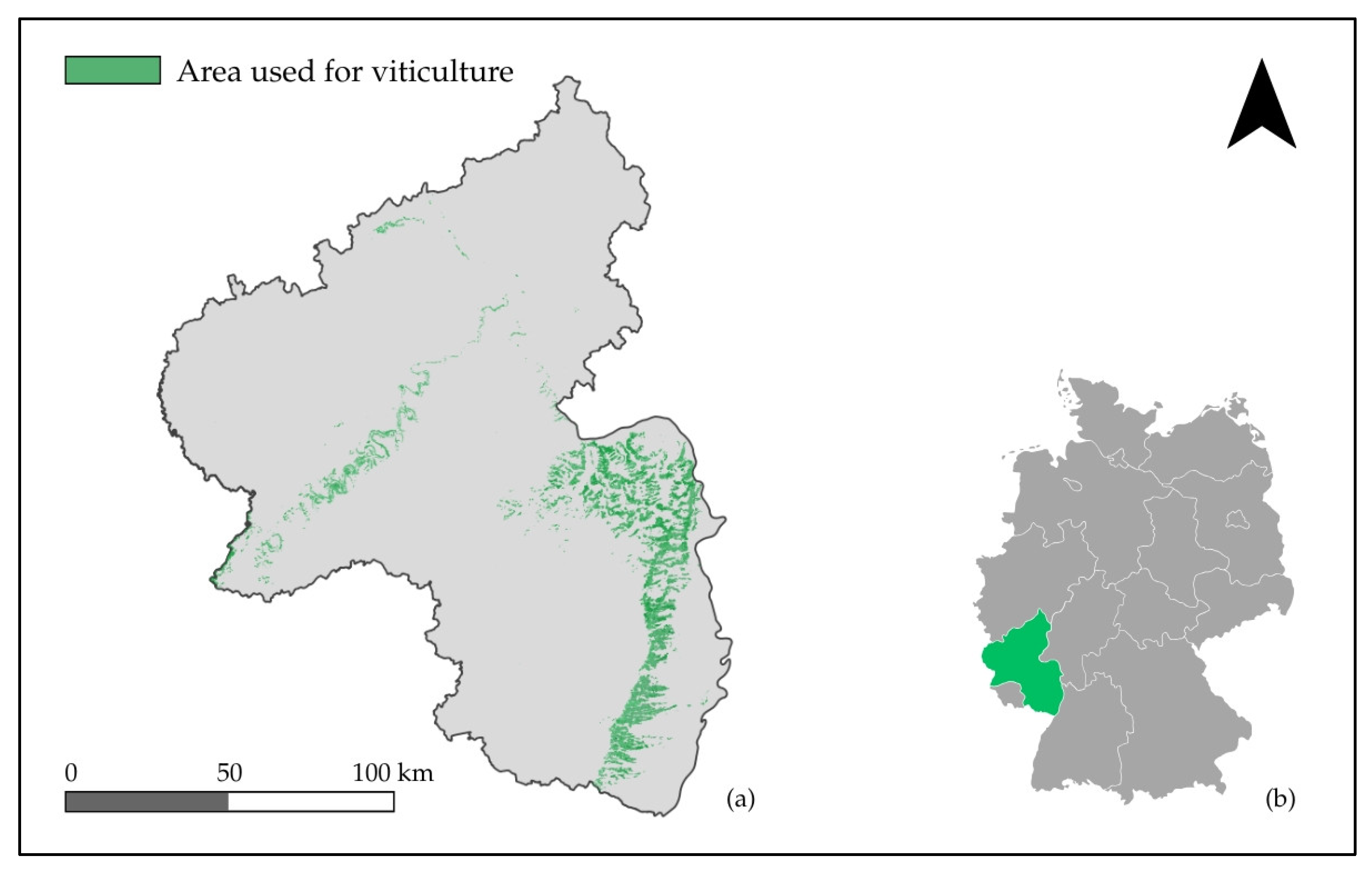 Figure 1. (a) Visualization of the vineyards (marked in green) within the borders of Rhineland-Palatinate; (b) location of Rhineland-Palatinate within Germany, highlighted in color for spatial orientation.