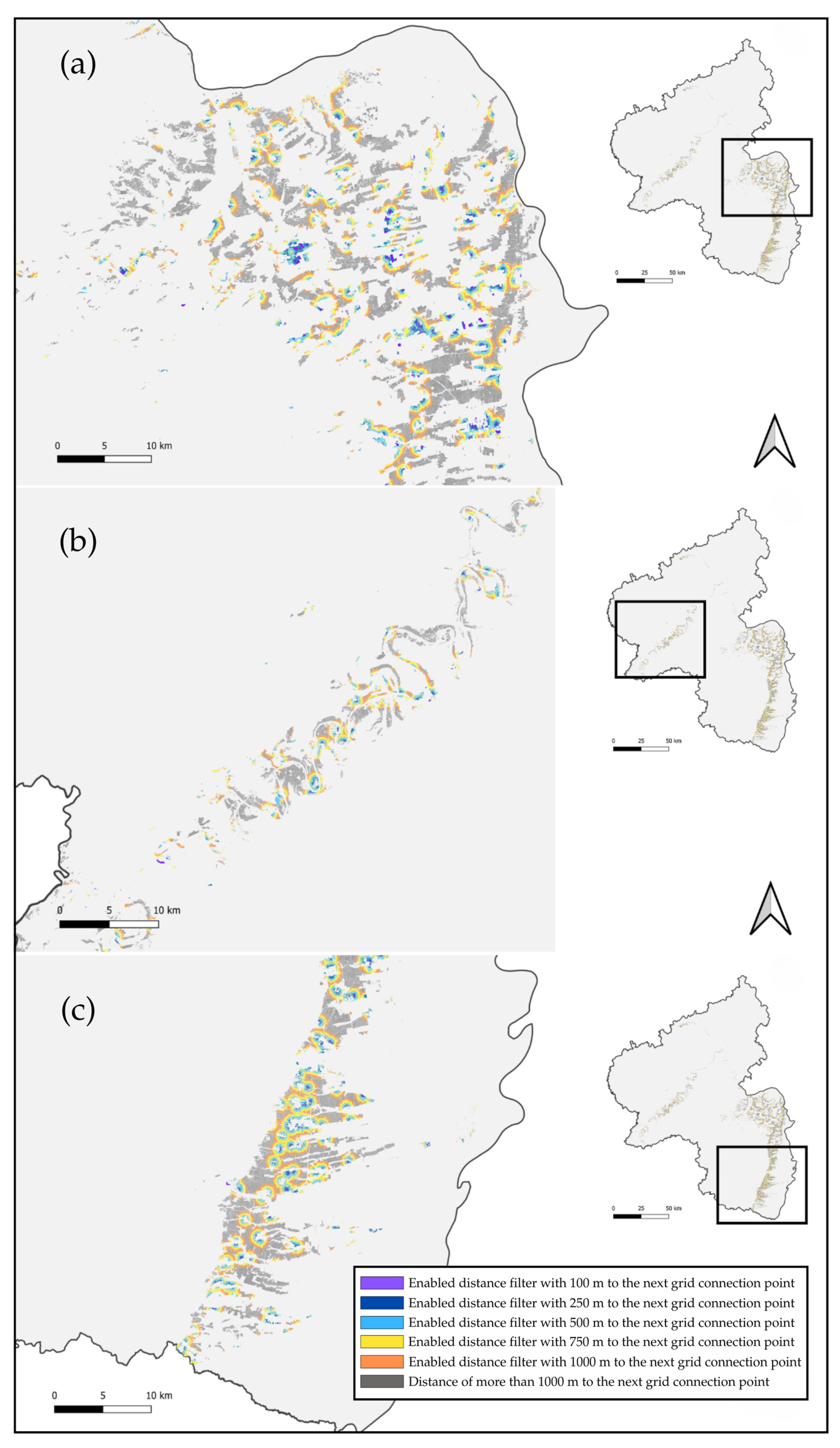 Grid access, in particular, emerges as a critical limiting factor [33]. Despite the overall viticultural area in Rhineland-Palatinate, the results show that only a small fraction of plots lie within 100 to 500 m of potential grid connection points. Given the cost and challenges associated with grid connection—ranging in Germany from EUR 80 to EUR 260 per linear meter—this constraint can have an important impact on the overall economic feasibility of the systems [34]. The process of connecting renewable energy projects to the grid is becoming a critical limiting factor in the expansion of renewable energy [35,36]. Strub et al. (2024) argue that grid connection costs should be considered in economic evaluations of agrivoltaic systems, as these costs significantly impact the feasibility of specific business models [19]. Even if a low value were applied to the cost per meter, a site around 1000 m away from a feed-in point could be economically unviable without further grid expansion. This makes areas near transformer stations and wind turbines attractive for grid connection [37]. However, further investigation is required to validate these potential feed-in points technically.