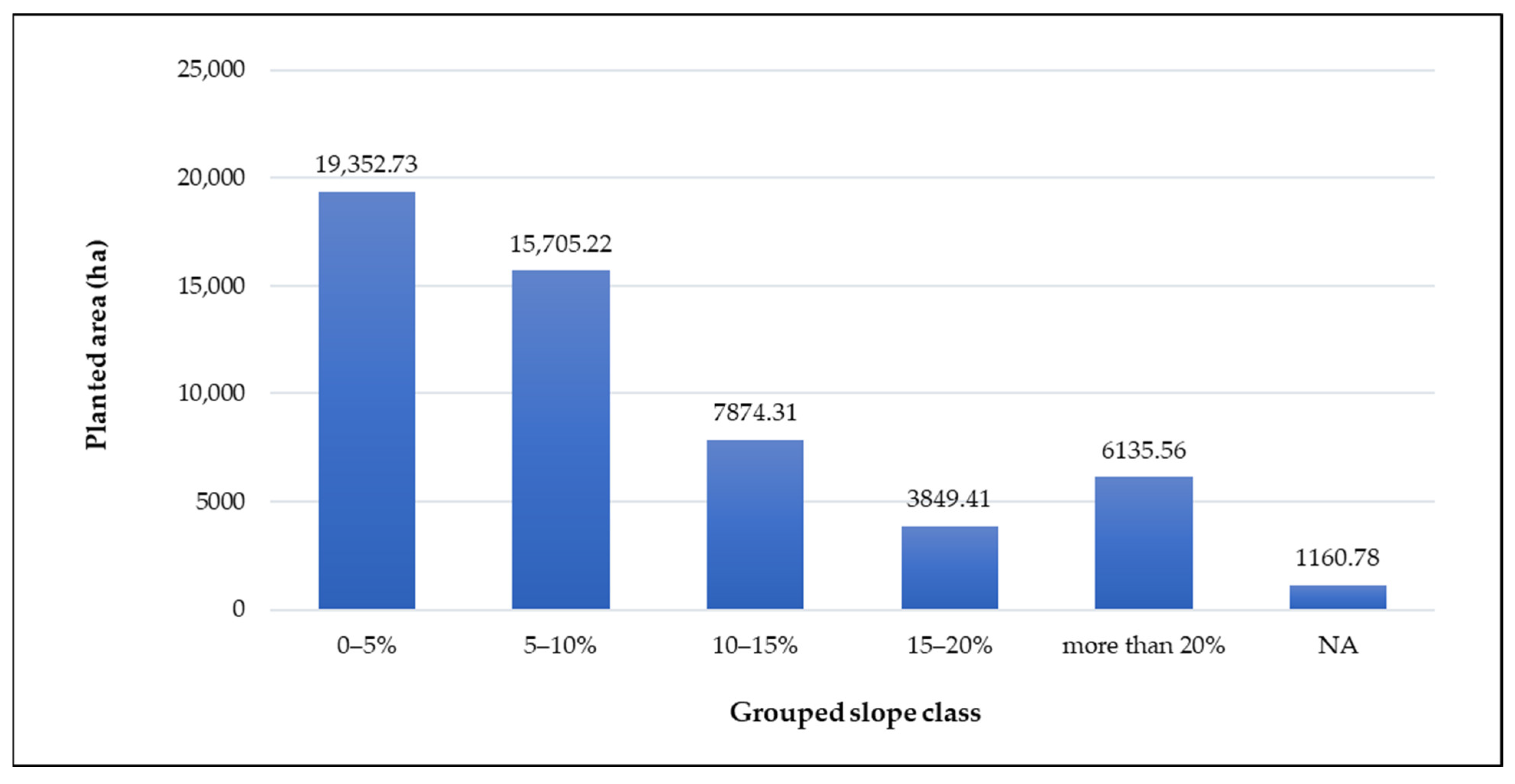 Table 4. Distribution of vineyard plots by plot size and slope class. Plot sizes are categorized as smaller than 2.5 ha and equal to or larger than 2.5 ha. Slope classes include 0–5%, 5–10%, 10–15%, 15–20%, more than 20%, and plots without slope data (NA). The totals in each column represent the sum of all slope classes per category.
