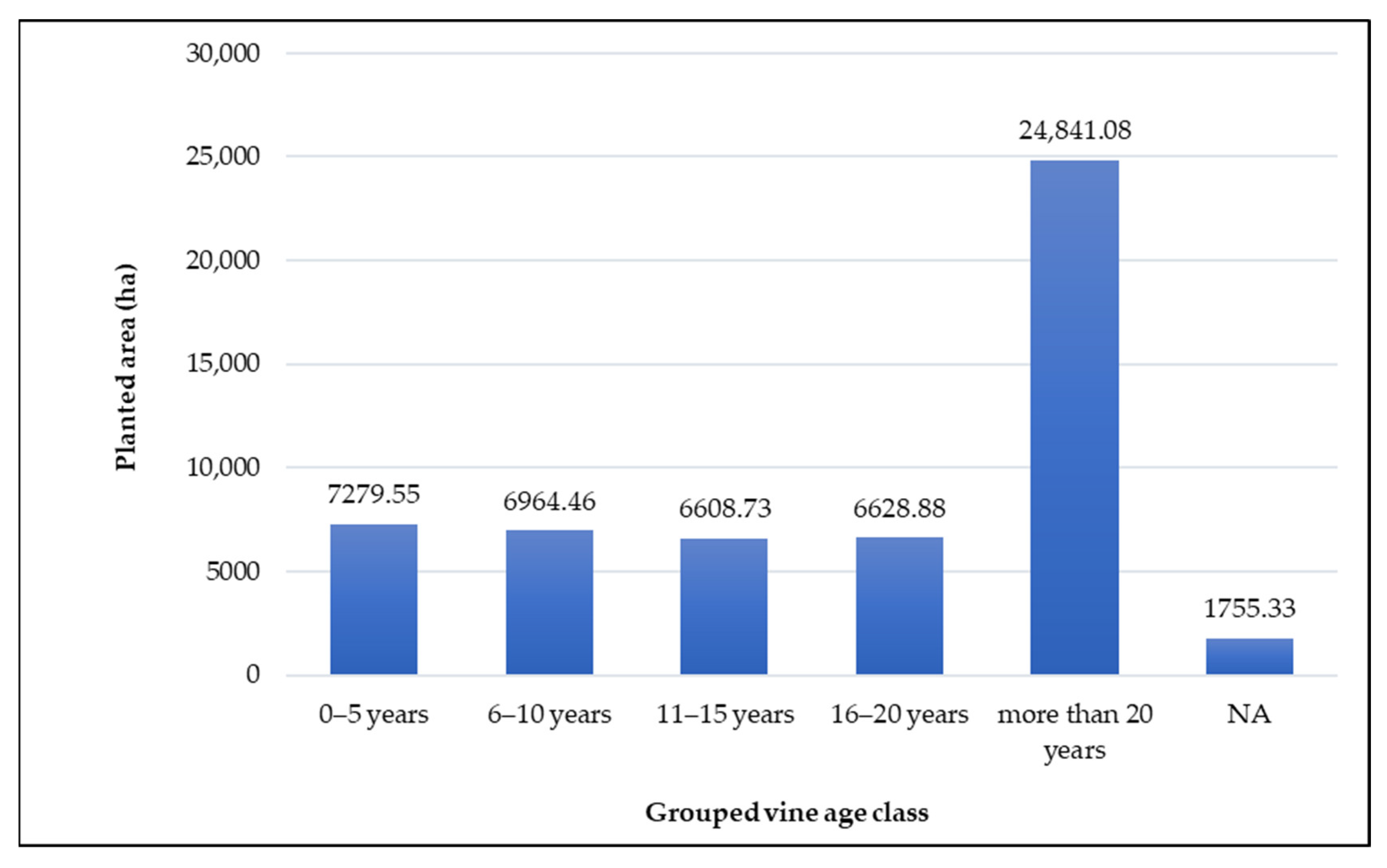 Table 6. Distribution of vineyard area by planting year category. Plots lacking vine age information are classified as NA (not available).