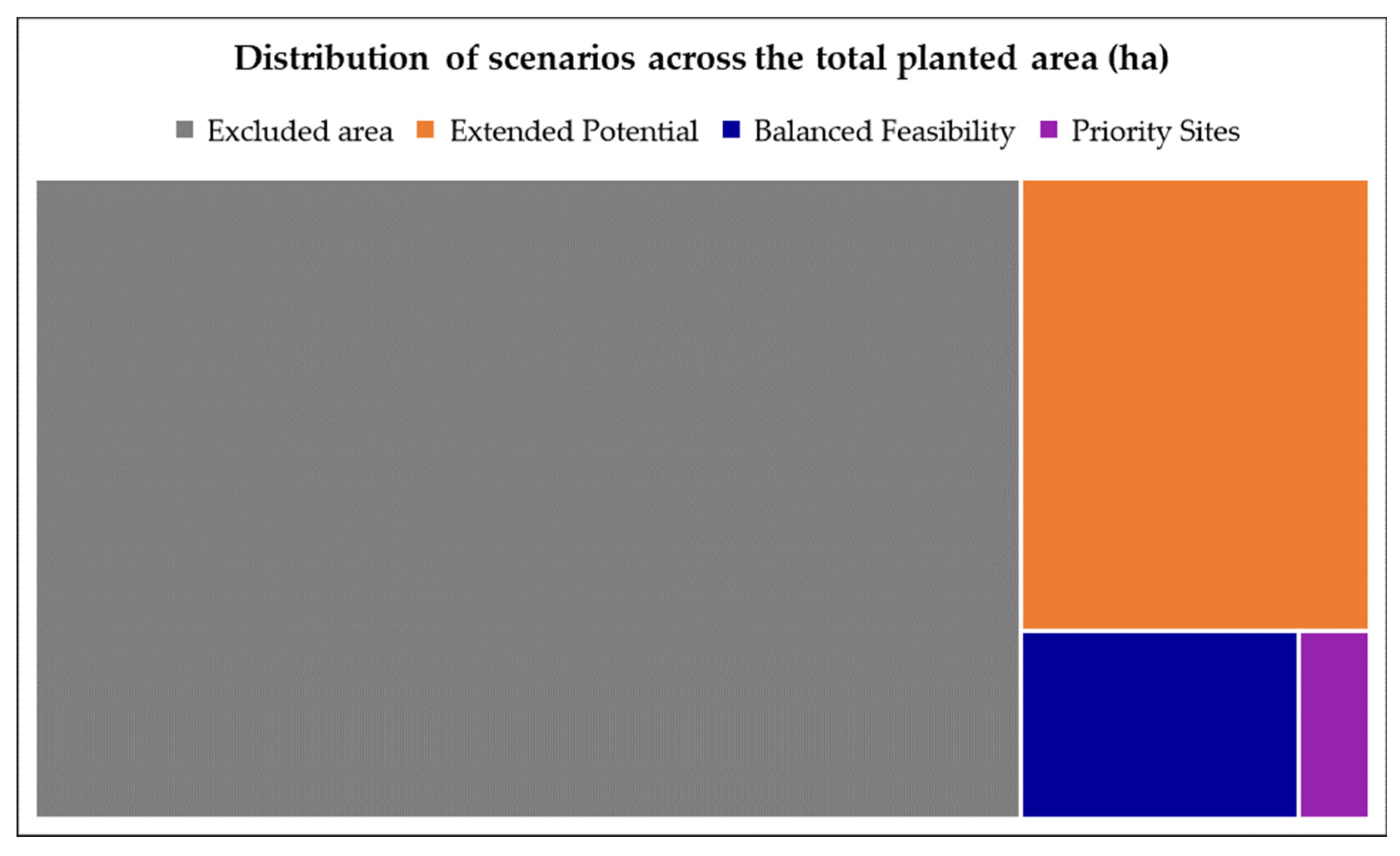 The ‘High Priority’ scenario employs the most stringent filter set, selecting vineyard plots with slopes of 0–10%, a planting age exceeding 15 years, and a grid connection within 250 m. Grape variety is not restricted, since replanting with a suitable shade-tolerant grape variety is highly likely. The ‘Balanced Feasibility’ scenario expands the slope tolerance to 15%, reduces the minimum planting age to over 10 years, and increases the allowable grid distance to 500 m. This combination reflects a more practical compromise between technical feasibility and land availability. The ‘Extended Potential’ scenario is the most inclusive, allowing slopes up to 20%, including all vineyards older than 10 years, and extending the maximum grid distance to 1000 m. While this setting increases area potential, it includes locations with lower technical or economic viability.
