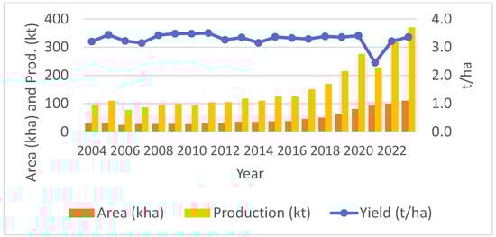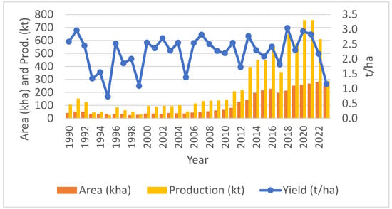 Area and production of triticale in Spain (1990–2023). Data from MAPA [49].