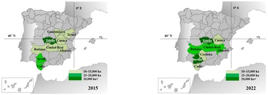 The most important triticale-cultivating provinces in Spain in 2015 and 2022. Data from MAPA [38]. The main triticale-cultivating province is underlined.