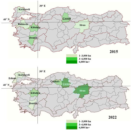 Map of Türkiye with the provinces with greater triticale production in 2015 and 2022. Data from TUIK [53]. The main triticale cultivating province is underlined.