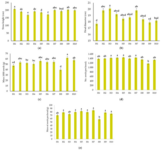 | Stem Height (cm) | Head Diameter (cm) | 1000-Seed Weight (g) | No. Seed per Plant | Mass of Seeds per Head (g) | |