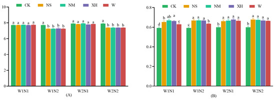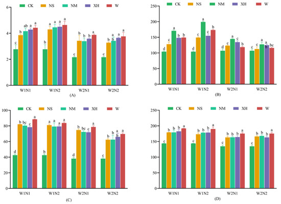 Soil pH under W1 conditions (Figure 1A): the W1N1-NS treatment exhibited a pH of 7.91, representing a statistically significant 7.03% reduction compared to W1N2-NS. NM, XH, and W showed no significant differences relative to the control treatment. Under W2 conditions, pH values across all treatments increased by 1.83% to 2.28% compared to W1, demonstrating that drought stress systematically promotes soil pH elevation. Soil Electrical Conductivity (EC) Variations reveal that under W1 conditions (Figure 1B), the W1N1-W treatment achieved the highest EC (668.01 μS cm−1), representing a statistically significant 4.94% increase compared to W1N1-NS (p ≤ 0.05). The W1N1-NM and W1N1-XH treatments demonstrated moderate increases of 2.44% to 3.5% relative to control. N2 treatments exhibited significantly elevated electrical conductivity compared to N1 treatments by 2.33%, providing empirical evidence that high N application intensifies soil salinity accumulation. Under W2 conditions, the W2N2-NM treatment recorded the maximum EC (698.17 μS cm−1), surpassing the W2N2-NS and control treatments by 2.66% and 16.09%, respectively. W2 treatments demonstrated electrical conductivity increases ranging from 0.7% to 5.51%.
