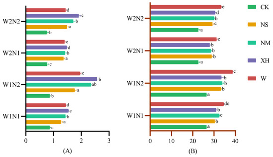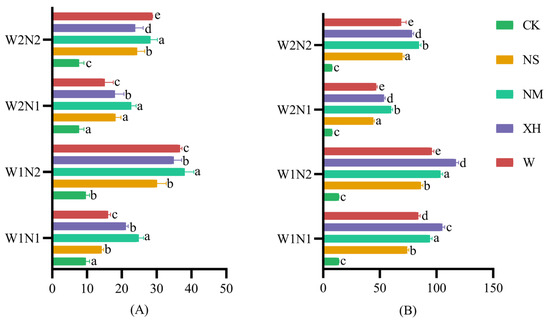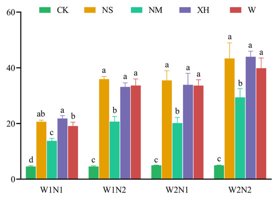Under W1 conditions, cumulative ammonia volatilization ranged from 13.76 to 35.94 kg N ha−1 across all treatments (Figure 5). The hierarchical ranking was established as follows: N2NS (35.94) > N2W (33.66) > N2XH (33.16) > N1XH (21.81) > N2NM (20.69) > N1NS (20.62) > N1W (19.10) > N1NM (13.76) > CK (4.56 kg N ha−1). Under W2 conditions, cumulative ammonia volatilization exhibited elevated ranges from 25.14 to 43.38 kg N ha−1. The treatment hierarchy was characterized as N2NS (43.38) > N2XH (43.40) > N2W (39.89) > N1NS (35.49) > N1W (33.63) > N1XH (33.91) > N2NM (29.40) > N1NM (25.14) > CK (4.96 kg N ha−1).