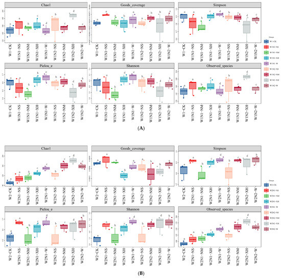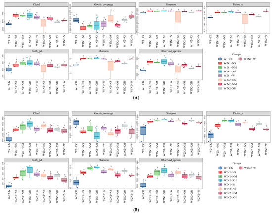Soil bacterial α-diversity indices under 75%FC (A) and 45%FC (B) across N rates and EENFs (presented in order: Chao1, Goods_coverage, Simpson, Pielou_e, Faith’s pd, Shannon, observed_species). Boxplots show median (horizontal line), interquartile range (box), and 1.5 × IQR (whiskers); outliers are plotted individually. Different lowercase letters indicate significant differences (Tukey’s HSD, p < 0.05). Colors represent treatment groups (n = 3). Statistical significance was evaluated with a full-factorial three-way ANOVA (Water × N × Fertilizer); details on significant interactions are provided in Supplementary Tables S4 and S5.