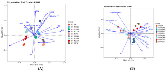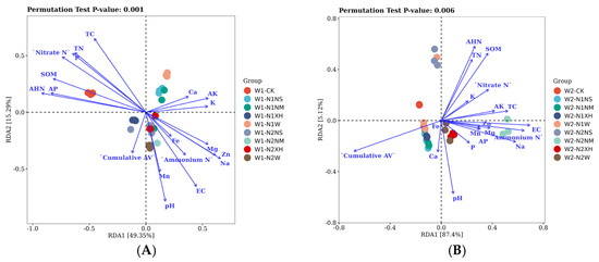 RDA permutation tests further quantified the contributions of environmental factors. Under 75%FC, bacterial communities exhibited an environmental explanatory power of 79.19% (Figure 8A), whereas under 45%FC, the environmental explanatory power reached 88.76% (Figure 8B). The explanatory variance for fungal communities demonstrated more pronounced differences, increasing from 64.64% to 92.52%, indicating that water stress intensified the deterministic role of environmental factors in microbial community assembly (Figure 9A,B). Concurrently, bacterial and fungal communities exhibited significantly differentiated response characteristics to environmental gradients. Under 75%FC conditions, SOM, TN, AP, AK, and micronutrients (Fe, Zn, Mn, Mg) constituted the primary positive driving factors for bacterial community distribution, while positive factors for fungal communities concentrated on carbon-N nutritional elements (SOM, TN, alkaline N, nitrate N). Under 45%FC, the importance of carbon-N factors (SOM, TN, TC, alkaline N) for bacterial communities increased, with micronutrients shifting to negative regulatory effects. The nutritional factor-driven effects for fungal communities were further strengthened. The distribution patterns of different N treatments in RDA ordination space revealed the regulatory mechanisms of N management on microbial communities. High N treatment groups (N2) tended to associate with nutrient-rich quadrants, whereas low N treatment groups (N1) were more influenced by physicochemical stress factors.