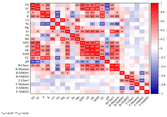 Pearson correlations matrix between soil physicochemical properties and microbial community structures. Color intensity indicates correlation coefficients for total nitrogen (TN), total carbon (TC), phosphorus (P), potassium (K), calcium (Ca), sodium (Na), magnesium (Mg), iron (Fe), zinc (Zn), manganese (Mn), alkaline-hydrolyzable nitrogen (AHN), available phosphorus (AP), available potassium (AK), soil organic matter (SOM), electrical conductivity (EC) and pH with bacterial Shannon diversity (B-Shannon), bacterial ordination axes (B-NMDS1 and B-NMDS2), fungal Chao1 (F-Chao1), fungal Shannon diversity (F-Shannon) and fungal ordination axes (F-NMDS1 and F-NMDS2). Asterisks below the panel denote significance levels. Color intensity indicates Pearson |r|; asterisks denote significance (* p ≤ 0.05, ** p ≤ 0.01).