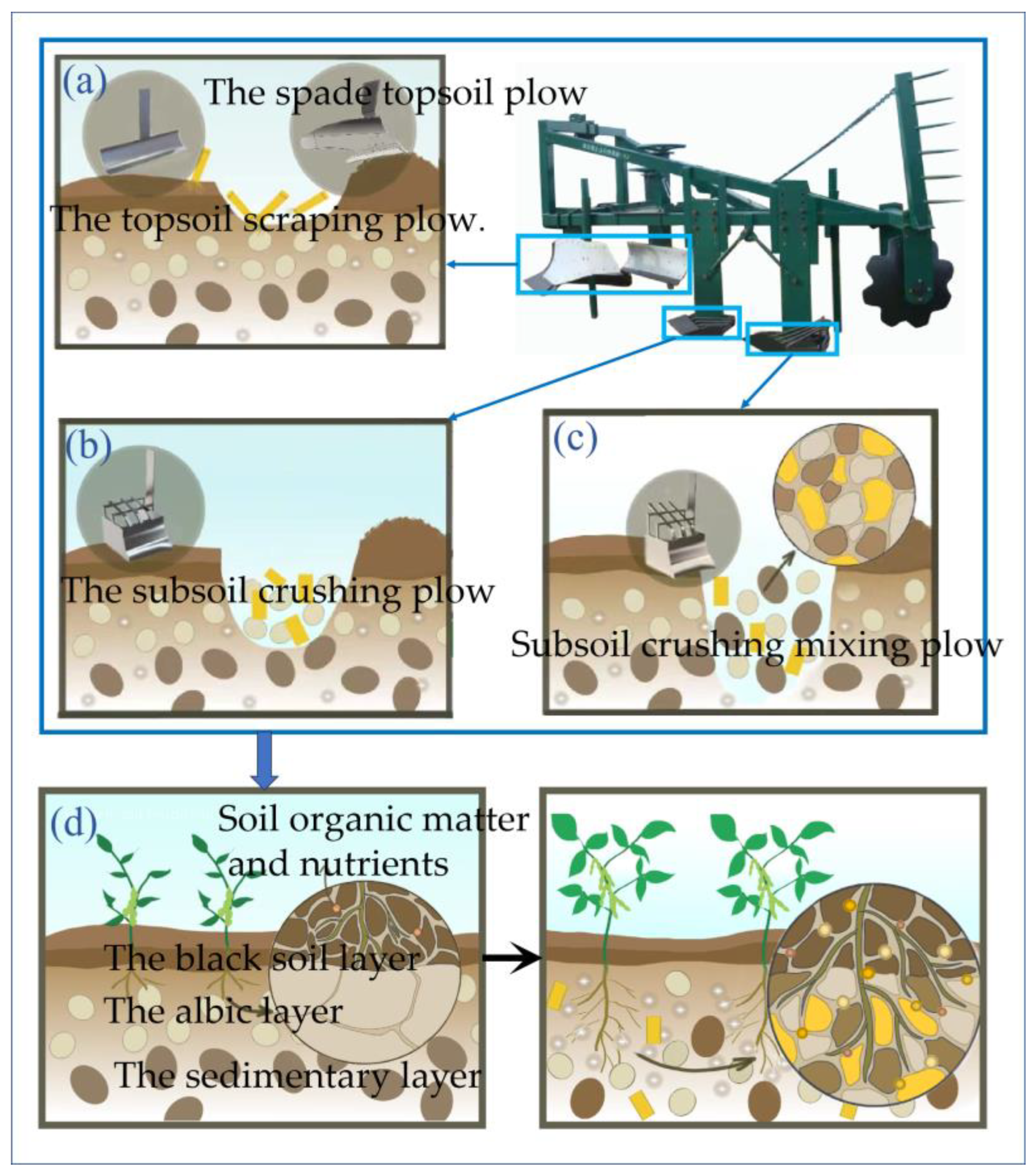 Traditional soil improvement methods, such as straw returning, forage grass planting, and progressive deep tillage, primarily enhance the physicochemical properties of the plow layer but fail to effectively disrupt the physical barrier of the albic layer. Numerous researchers have focused on enhancing soil structure and nutrient availability through the addition of external amendments, with straw returning emerging as a widely adopted and effective practice [10,11,12]. A meta-analysis of 41 long-term trials in Europe demonstrated that straw returning increased yields by 6.0% [13], while a 22-year field experiment in China revealed a significant 13.71% yield enhancement compared to conventional tillage [14].