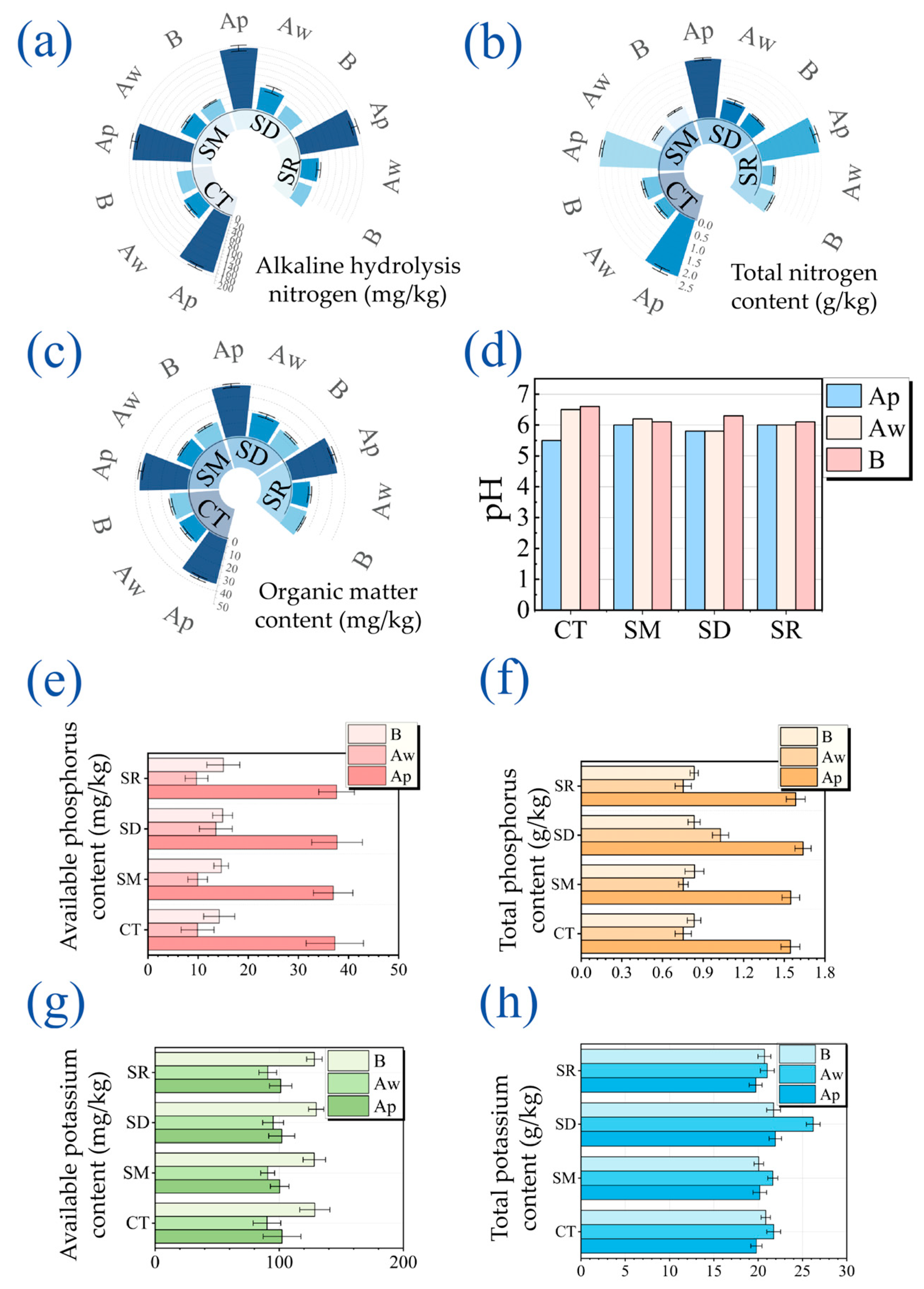 Changes in soil pH were as follows. Laboratory analysis of soil pH across different straw return methods revealed distinct trends by soil layer. In the Ap layer, all three treatments increased pH compared to CT. However, in the Aw and B layers, pH decreased under all treatments relative to CT. Notably, no significant differences in pH were observed among treatments within any layer (Figure 3d).