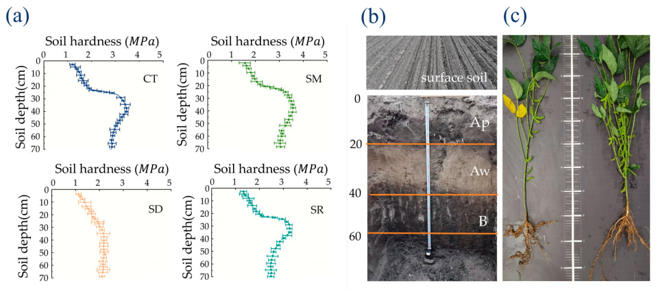 After two years of soil improvement treatments, the results of soil hardness measurement are shown in Figure 4a, while Figure 4b presents the profile characteristics and topsoil conditions of albic soil before treatment. As shown in Figure 4a, under the four treatments, the soil hardness in the Ap horizon all ranged between 1 and 2, with hardness in the order of SD < CT < SR < SM. With the increase in soil depth, soil hardness gradually increased, reaching the maximum in the Aw horizon. Compared with the CT treatment, the soil hardness of SR and SM treatments showed no significant difference, and their maximum hardness both exceeded three, with the soil hardness of SM treatment remaining the largest. After that, with the further increase in depth, the soil hardness of these three treatments gradually decreased, with hardness in the order of SR < CT < SM. In contrast, the soil hardness of the SD treatment decreased significantly, with a maximum hardness of approximately 2 MPa, representing a 43.56% reduction compared to the CT treatment. The soil hardness of the Aw horizon was close to that of the B horizon. Figure 4c illustrates soybean root distribution in the CT and SD treatments. The CT treated roots (left panel) were predominantly concentrated in the Ap layer, with sparse root penetration below 25 cm, where only perennial weed roots were observed. In contrast, SD treatment (right panel) promoted deeper root growth, with soybean roots extending beyond 30 cm and showing significantly increased root density in subsoil layers.