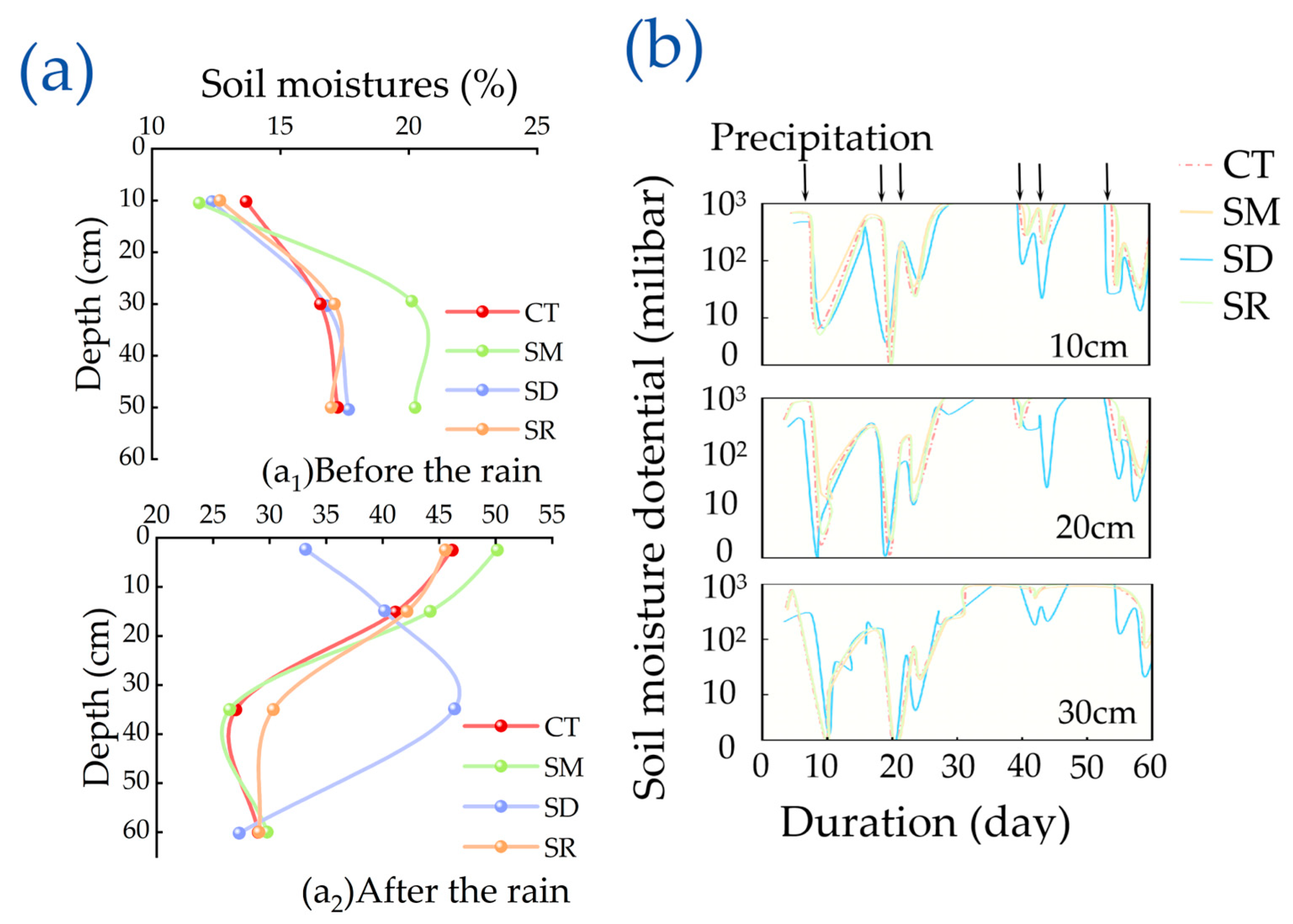 Soil moisture dynamics monitoring results showed that during the second growing season, daily monitoring of soil moisture dynamics under four treatments was conducted using tensiometers (Figure 5b), revealing significant differences in hydrological responses of underground drainage patterns. After rainfall, the soil pore water potential (mbar) of each treatment showed obvious differences: the SM treatment had higher pore water potential than the CT treatment at 10 cm and 20 cm depths, which was the highest among the four treatments, while the pore water potential at 30 cm depth was lower than that of the CT treatment; the SD treatment consistently had lower pore water potential than the CT treatment at 10 cm, 20 cm, and 30 cm depths; the difference in pore water potential between the SR treatment and the CT treatment was small, showing an overall fluctuating trend. Quantitative analysis indicated that compared with the CT treatment, the SD treatment reduced the number of days with pore water potential exceeding 1000 mbar by 3.5 days at 10 cm depth, 8.5 days at 20 cm depth, and 9.5 days at 30 cm depth. It is noteworthy that the surface soil of the CT treatment showed a rapid drainage response, with pore water potential dropping below 10 mbar after rainfall, indicating an oversaturated state. In contrast, the SD treatment had a moderate drainage rate, and the pore water potential at 10 cm depth remained at a relatively high level, which not only improved soil water retention capacity but also avoided waterlogging by enhancing underground drainage channels.