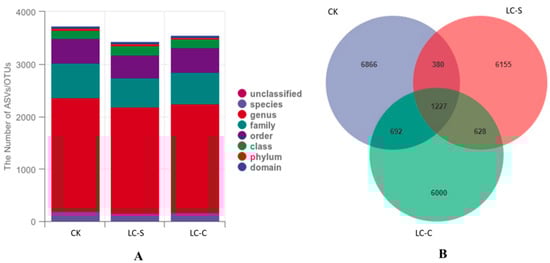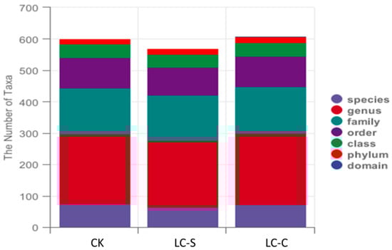 For the control CK, the taxonomic composition was characterized by the following relative abundances of domain (1; 0%), phylum (16.67; 3%), class (44; 7%), order (97; 16%), family (146; 24%), genus (223.33; 37%), and species (73.67; 12%) (Figure 3). For the LC-S treatment, the taxonomic distribution included domain (1; 0%), phylum (19; 3%), class (40; 7%), order (90; 16%), family (143.33; 25%), genus (213.33; 37%), and species (63.67; 11%) (Figure 3). Likewise, the taxonomic structure of the LC-C treatment comprised domain (1; 0%), phylum (18.67; 3%), class (44.33; 7%), order (96.33; 16%), family (148.67; 24%), genus (227; 37%), and species (72.33; 12%) (Figure 3).