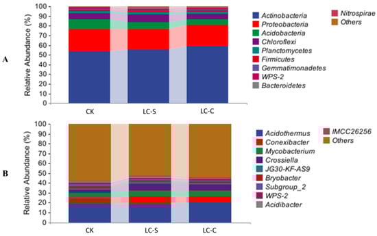 The taxonomic composition of soil bacterial communities in the treatments of CK, LC-S, and LC-C was analyzed by assessing the relative abundance of the top 10 bacterial phyla and genera (Figure 4). Across all treatments, the dominant phyla included Actinobacteria, Proteobacteria, Acidobacteria, Chloroflexi, Planctomycetes, Firmicutes, Gemmatimonadetes, WPS-2, Bacteroidetes, and Nitrospirae (Figure 4A), while the predominant genera comprised Acidothermus, Conexibacter, Mycobacterium, Crossiella, JG30-KF-AS9, Bryobacter, Subgroup 2, WPS-2, Acidibacter, and IMCC26256 (Figure 4B). In the rhizosphere soil of CK, Actinobacteria represented the most abundant phylum (53.56%), followed by Proteobacteria (22.86%), Acidobacteria (10.49%), Chloroflexi 6.10%), and Gemmatimonadetes (1.55%) (Figure 4A), and Acidothermus was the predominant genus (19.20%), followed by Mycobacterium (6.14%) and Conexibacter (4.71%) (Figure 4B).