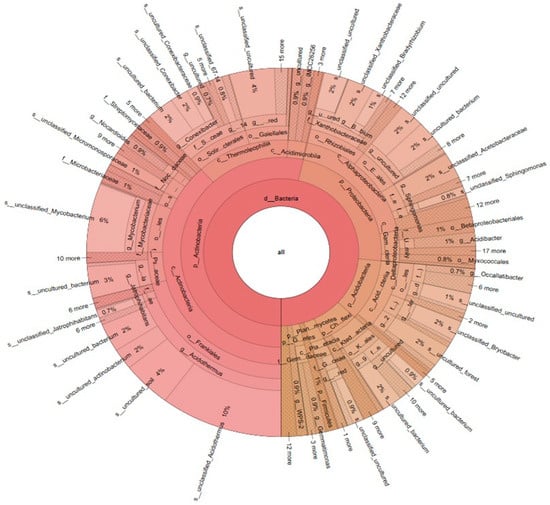 The genus-level dominance was observed for Acidothermus (19%), Mycobacterium (6%), Conexibacter (6%), Crossiella (5%), Bryobacter (2%), JG30-KF-AS9 (2%), Subgroup 2 (1%), and WPS-2 (1%) across all the treatments. Minor yet notable genera included Bradyrhizobium (0.7%), Beijerinckiaceae (0.5%), Gemmatimonas (0.6%), and Isopharaceae (0.7%) across all the treatments. These findings illustrate a consistent hierarchical structure across taxonomic levels, with Actinobacteria and Proteobacteria emerging as key phyla, and Acidothermus representing the most abundant genus across all the treatments.