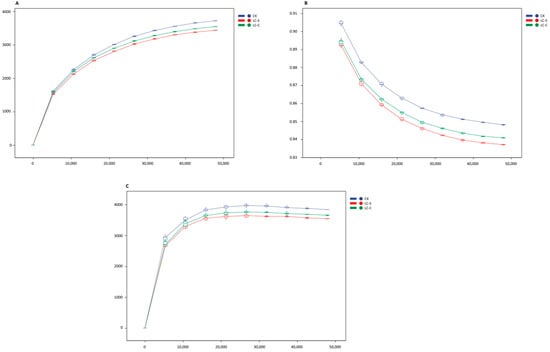 Rarefaction curves were constructed in QIIME2 (v2019.4) to evaluate the adequacy of sampling and to compare alpha diversity among samples at standardized sequencing depths. In line with ecological principles [,], the analysis iteratively subsampled the sequence library of each sample (without replacement) at incrementally increasing depths, reaching up to 95% of the original read count. At each depth level, the average number of observed ASVs was calculated over 10 replicate subsamples. This curve visualizes the asymptotic relationship between sequencing effort and richness (ASV accumulation), enabling comparisons of diversity across samples at consistent sequencing depths and confirming whether community richness was sufficiently captured.