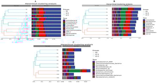 Hierarchical clustering analysis of bacterial communities in the rhizosphere soil of monoculture tea plantation (CK; CK1, CK2, and CK3) and leguminous cover-cropped tea plantations with soybean (LC-S; S1, S2, and S3) and cowpea (LC-C; C1, C2, and C3). (A) Phylum-level clustering; (B) genus-level clustering; (C) species-level clustering.