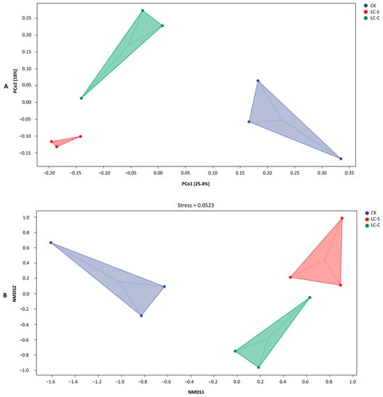 PCoA and NMDS visualizations, supported by the PERMANOVA test, confirmed significant differences (p < 0.05) in tea rhizosphere soil microbial community diversity among the treatments of CK, LC-S, and LC-C (Figure 9). LC-S and LC-C significantly altered the bacterial community diversity compared to the control of CK, and the non-overlapping 95% confidence ellipses illustrated significant clustering between LC-S/LC-C and CK.