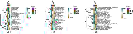 Cluster heat map of bacterial communities in the rhizosphere soil of monoculture tea plantation (CK) and leguminous cover-cropped tea plantations with soybean (LC-S) and cowpea (LC-C), (A) cluster heat map across phyla; (B) cluster heat map across genera; (C) cluster heat map across species.