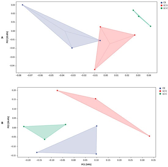 The Principal Component Analyses (PCA) at phylum levels revealed distinct patterns in tea rhizosphere soil microbial community structure among the treatments of CK, LC-S, and LC-C, and it exhibited a cumulative variance of 85.6% (PCI1: 61.8% and PCI2:23.8%) (Figure 11A). The non-overlapping 95% confidence ellipses demonstrated significant differences among CK, LC-S, and LC-C (p < 0.05), and LC-S and LC-C represented similar phylum-level communities relative to CK as revealed by PCA analysis (Figure 11A).