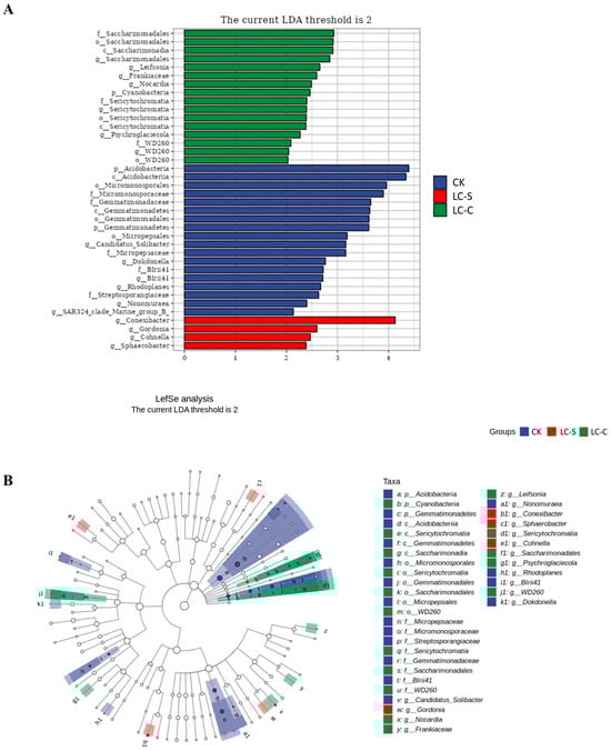 The species-level cluster heat map (SCHM) demonstrated minimal differentiation in bacterial community composition among the treatments of CK, LC-S, and LC-C, with minimal variation in relative abundance (color scale: −1.15 to 1.15), and these three treatments had the same dominant species of Acidobacterium_BGR, Thermononosporaceae; just Mycobacterium_celatum had marginally higher abundance in the control of (Figure 10C) CK. High overlap in species composition across three treatments corroborated beta hierarchical clustering results, indicating limited species-level differentiation in bacterial community composition among the treatments of CK, LC-S, and LC-C.