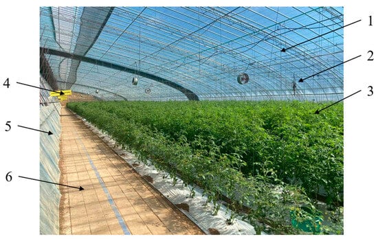 After field research and a literature review, it was found that greenhouses in northern China generally adopt single-slope arched structures, which have good insulation and energy-saving effects [12]. The greenhouse tested in this article is located in Pinggu District, Beijing. The greenhouse consists of north and south side walls, an insulated east wall, and a front sloping roof, with a length of about 150 m and a side wall width of 15 m. There is a 1–2 m wide cement walkway under the east wall [13]. The greenhouse tomato planting in this experimental field is mainly a north–south planting mode, with a row spacing of 1 m, a plant spacing of 0.3 m, and a plant height greater than 1.5 m, as shown in Figure 1.