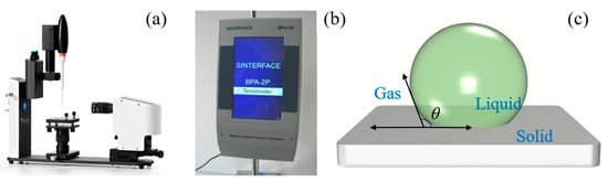 Figure 2. Methods and instruments used for measuring contact angle and surface tension: (a) contact angle measuring instrument; (b) surface tension meter; (c) principle of measuring contact angle.
