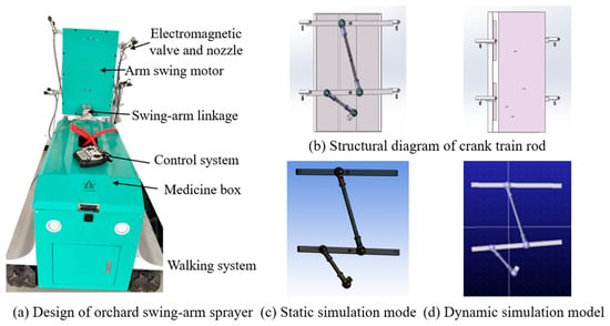 Greenhouse tomato cultivation is mainly close planting and hanging vine planting. The greenhouse space is narrow and it is difficult for machines and tools to enter the ridge for operation [12], in order to achieve the control of tomato diseases and insect pests and determine the effect of pesticide application. Considering the poor application effect of ordinary spraying on the middle and upper canopies of high-stem dry crops, such as tomatoes, combined with the operation action of traditional fruit farmers’ manual applications, a swing-arm mechanism for the sprayer is designed independently. Through the swing-arm mechanism, the spray bar is driven to swing up and down, and the spray angle is changed to mimic human-simulated work, so as to improve the effect of spraying [18]. The swing-arm mechanism is mainly used to achieve the up-and-down swinging action of the spray bar. Considering the high operating strength of the swing-arm mechanism to be the most critical part of the spray machine, 45 steel is used in this paper to make it able to withstand large loads and have strong wear resistance. The material density is 7.85 g/cm3, the yield strength is higher than 355 MPa, its elastic modulus is 196–206 GPa, and its Poisson’s ratio is 0.24–0.28. Considering that the swing amplitude of the spray bar is adjusted at around 0.3 m, and the transmission distance between the cam and the eccentric mechanism is relatively short, a larger size is required for implementation. The crank connecting rod mechanism has a simple and reliable structure, low manufacturing cost, strong load-bearing capacity, high transmission efficiency, and can be designed with the required length according to the design needs. Therefore, in this design, the swing-arm structure adopts a crank connecting rod mechanism. The swing-arm mechanism is used to support the spray bar, nozzle, pipeline, and other components, driving the nozzle to swing up and down within a certain range, as shown in Figure 3b. The swing arm adopts a rectangular hollow tube design, which is lightweight, strong, and has good bending and torsion resistance. The material is made of aluminum alloy and polished to reduce contact with the liquid and enhance corrosion resistance. The design is divided into two parts: an upper swing arm and a lower swing arm.