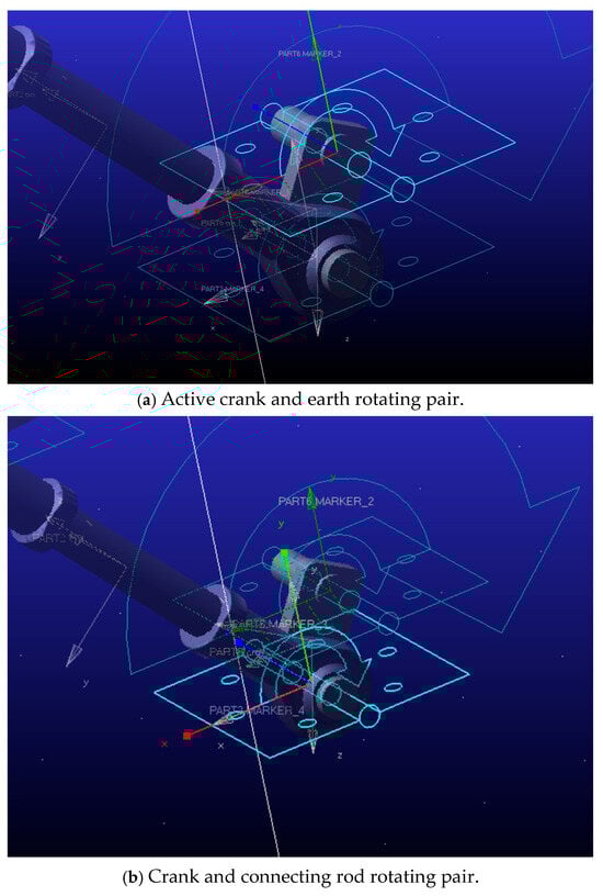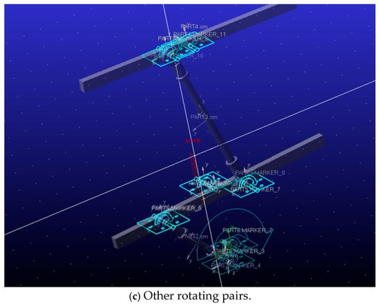 Considering that the strength of each component of the swing-arm structure of the greenhouse sprayer will be damaged during the working process, a static analysis of the swing-arm mechanism is carried out to verify the rationality and safety of the swing-arm structure. We use SOLIDWORKS 2024 (Dassault Systemes, Concord, MA, USA) modeling software to model the swing-arm structure, and then import it into ANSYS 2024 (ANSYS Inc., Pittsburgh, PA, USA) software for a finite element analysis, as shown in Figure 3c. The swing arm and spray bar structure are made of 6061 aluminum alloy material, while the crank and the connecting rod structure are made of high-strength structural steel. A total of 30,968 nodes and 14,514 elements are automatically divided into tetrahedral grids with a grid size of 10 mm. In order to more accurately reflect the stress and strain situation of the swing-arm structure during operation, and to analyze the motion process of the swing-arm structure, dynamic simulation of the swing-arm structure is carried out in ADAMS, as shown in Figure 3c. To accurately establish the kinematic constraint relationship between the components, appropriate motion pair constraints need to be applied based on the actual motion characteristics of the swing-arm mechanism. After reasonably setting the types of constraints, such as the rotating and moving pairs between the components of the swing-arm mechanism, the constraint relationships of the swing-arm mechanism are shown in Figure 4.