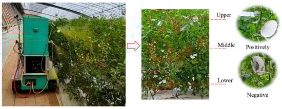 The experimental method is as follows: (1) Determine the sampling points: Select two adjacent tomato plants for each experimental point, and select two experimental points as sampling points for each experiment [24]. (2) Organize test cards and filter paper: Each sampling point is subjected to positive and negative sampling, with a total of 24 filter papers and 24 test cards for each experiment, located in the upper, middle, and lower layers of the tomato tree crown. The ground part is collected in a culture dish [25], with 4 samples per experiment (Figure 6). (3) According to the experimental scheme, the field tomato application experiment using the swing-arm sprayer is carried out. (4) Collect samples: Filter paper is used to measure the spray deposition on the tomatoes at different canopy positions, and test cards are used to measure the coverage. (5) Result processing: Use DepositScan software to analyze the scanned test card images, determine coverage, and calculate the coefficient of variation. Use a microplate reader (diluted 20 times) to optically analyze the deposition amount of droplet distribution on filter paper.