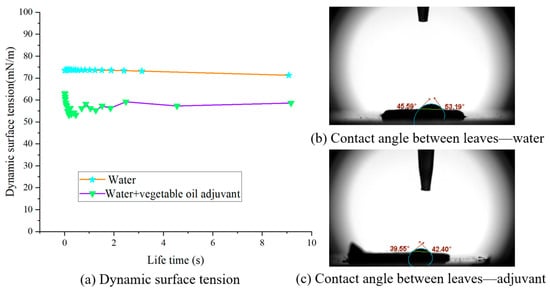 The dynamic surface tension of spray liquid is shown in Figure 7a. The average value of water and auxiliary solution was 73.55 and 68.05 mN m−1, respectively. However, enhancing the wetting time of the pesticide improved the spreading performance and adhesion of droplets on the tomato surfaces [29].