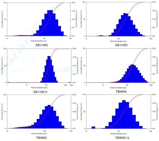 The droplet size spectrum of spray solution using an indoor spray platform [30] are shown in Table 2 and Figure 10. According to the JB/T9782-2014 standard [31], under the same stable pressure, nozzle models 015 and 02 produced small droplets, while nozzles 03 and 04 produced medium-sized droplets, with little difference in their numerical values. Adding an auxiliary solution slightly increased the particle size, but the RS value was smaller and more stable [27]. The relative span (RS) of droplet distribution shows that the RS values of nozzles 015, 02, and 03 were relatively small, while the RS value of nozzle 04 was about 1.734, which was the highest. Adding additives reduced the RS value. With the addition of additives, the RS value of nozzle 02 decreased from 1.305 to 1.021.