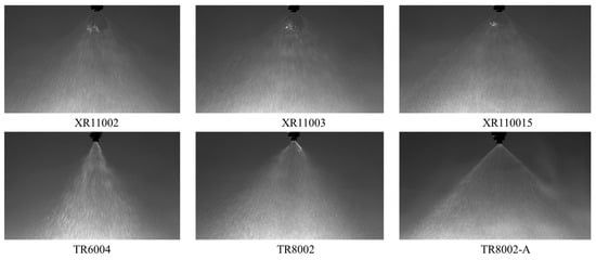 The swing-arm sprayer designed in this paper is an innovative design, and the shapes and models of related nozzles are difficult to determine. Therefore, an indoor high-speed camera spray performance test platform was built [30]. By testing five nozzles with different shapes and models under the same pressure (0.1 MPa), the sprayers with the best performance were preliminarily selected according to their atomization effects, and used for the subsequent field experiments to reduce the test burden. The spray effect is shown in Figure 11. The fog shape of the fan-shaped nozzle XR110015 was too dispersed, and it was easy for the fine-sized particles size to spread and drift away. The fog shape of nozzles XR11002 and XR11003 was relatively concentrated, and the coverage was relatively wide. The three-dimensional coverage of the conical nozzles TR8002 and TR6004 was more extensive, the overall spray effect performance was also better, and the spray effect after adding additives was better.