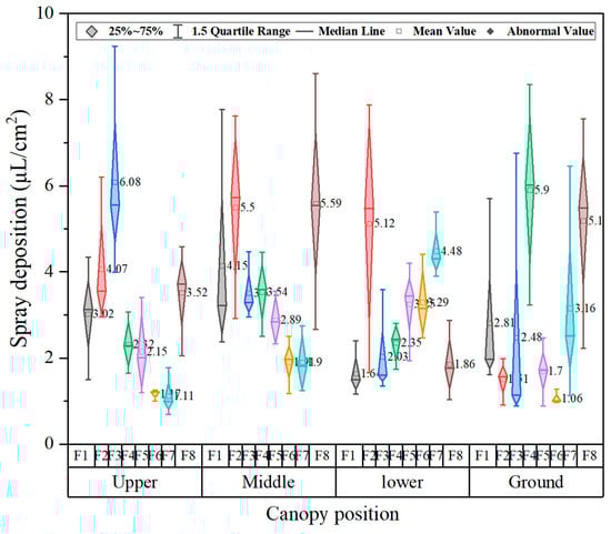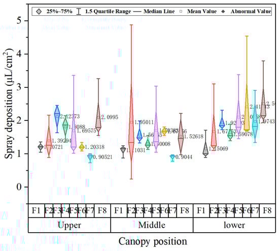 The deposition amount on the back of the leaves was lower than that on the front of the leaves (Figure 13). In all positions of the canopy [32], the deposition amount of F8 group was the highest. The deposition of fog droplets on the back of tomato leaves followed the order lower > upper > middle (1.918 μL/cm2, 1.555 μL/cm2, and 1.467 μL/cm2, respectively). The deposition amount of F8 on the upper, middle, and lower parts of the canopy was 2.100 μL/cm2, 1.526 μL/cm2, and 2.507 μL/cm2, respectively. The total deposition of F8 on the canopy was higher than that of other groups, indicating that adding additives is beneficial for increasing the droplet deposition on leaf backs. Considering that there was less deposition on the back of the lower canopy, this may have been due to the insufficient swing-arm amplitude of the swing-arm mechanism for the lower part, similar to the direct deposition of droplets from top to bottom in a closed greenhouse environment.