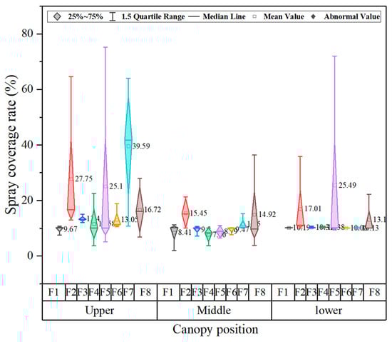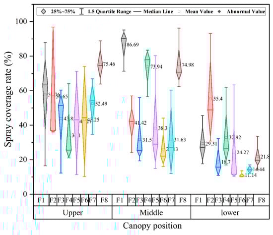 Figure 14. Spray coverage rate of upper, middle, and lower canopy leaves’ fronts.