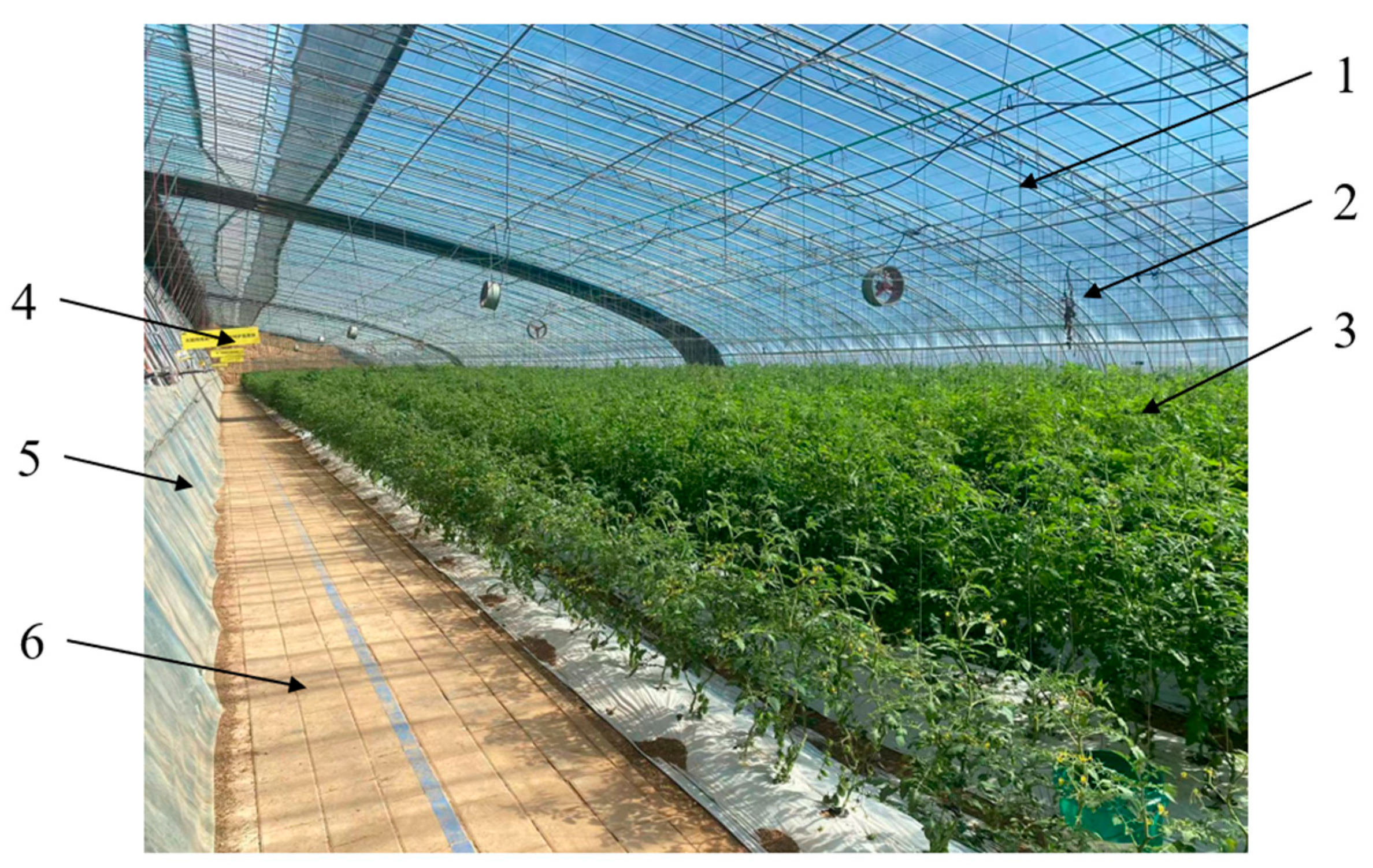 - Lin, B.; Song, H.; Liu, G.; Qi, Z.; Guan, R.; Wei, M.; Zhang, G.; Jia, Y.; Wang, S. In-situ testing and analysis of aerodynamic characteristics of tomato plants in large-span arched greenhouse. Comput. Electron. Agric. 2025, 230, 109891. [Google Scholar] [CrossRef]