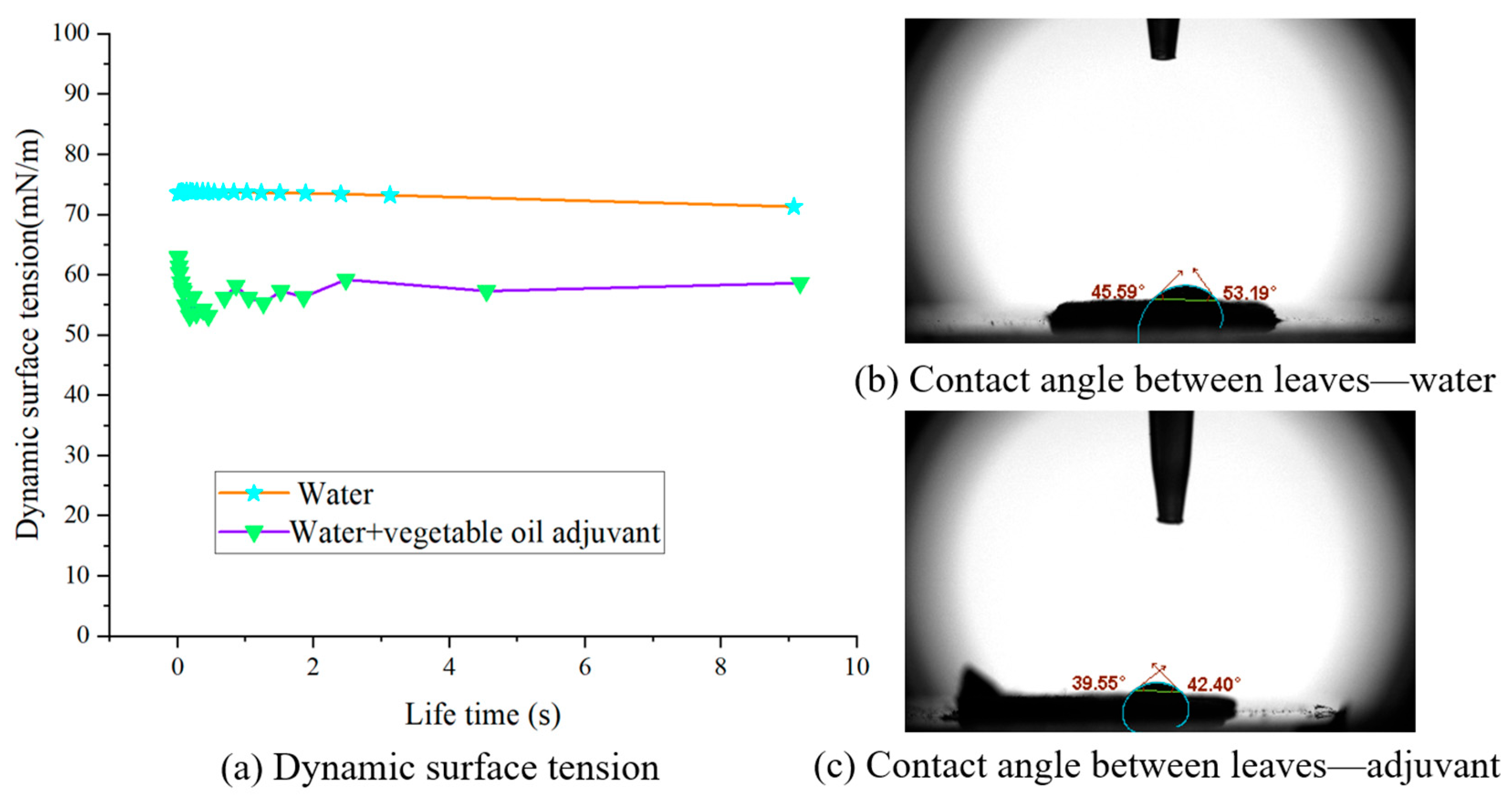 - The average values of water and auxiliary solution were 73.55 and 68.05 mN m−1, respectively. The average contact angle between the water and tomato leaves was 49.39°, while the contact angle of the auxiliary solution on the tomato leaves decreased to 40.98°. This indicates that the addition of additives to the liquid reduces the contact angle on the tomato leaves.